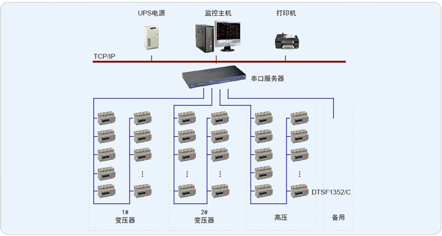 該現(xiàn)場為高壓10kV和0.4KV低壓配電室,共53塊儀表多功能智能儀表( DTSF1352/C),監(jiān)控值班室位于變電所隔壁,通過組態(tài)軟件Acrel-2000實現(xiàn)對現(xiàn)場儀表的實時監(jiān)測,并記錄歷史數(shù)據(jù)自動生成報表,以便查詢。為滿足配電室統(tǒng)一監(jiān)控的要求,配電現(xiàn)場安裝的安科瑞公司網(wǎng)絡電力儀表通過屏蔽雙絞線手拉手式相連至后臺主機內(nèi)的工業(yè)串口卡,實現(xiàn)對現(xiàn)場數(shù)據(jù)的采集,存儲,處理,實時顯示以及歷史查詢。