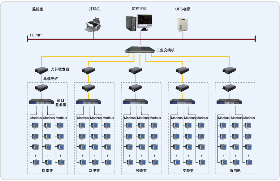 本項目針對現(xiàn)場3個低壓配電室(A、B、C)內(nèi)安裝的100只左右電力儀表。監(jiān)控室在A配電室內(nèi),B配電室距離A配電室200米左右,儀表為20只左右。另一個C配電室距離A配電室600米左右,儀表為40只左右。