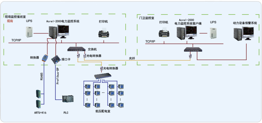 飛浦電子技術(shù)(上海)有限公司動力房設(shè)備報警系統(tǒng),是在現(xiàn)有報警系統(tǒng)的基礎(chǔ)上進行的智能化改造項目。原有系統(tǒng)基于西門子PLC采集現(xiàn)場各種傳感器變位或報警信號,再通過聲、光形式輸出報警信號。為了便于管理和維護,將動力房設(shè)備報警系統(tǒng)PLC數(shù)據(jù)以及部分未接入PLC的報警開關(guān)量通過安科瑞ARTU裝置采集至現(xiàn)有的安科瑞Acrel-2000電力監(jiān)控系統(tǒng);在門衛(wèi)監(jiān)控室增加兩臺監(jiān)控計算機,一臺作為安科瑞Acrel-2000電力監(jiān)控系統(tǒng)客戶端,另一臺整合了動力房設(shè)備報警系統(tǒng)遠程訪問客戶端;原監(jiān)控值班室和門衛(wèi)值班室之間通過光纖組建局域網(wǎng),實現(xiàn)系統(tǒng)遠程監(jiān)控。