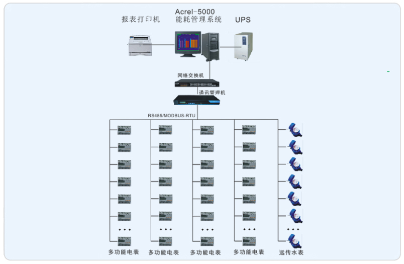 系統采用Acrel-5000型能耗檢測系統,整個系統采用網絡分布式結構,監控主機位于旋極科技大廈一樓機房內,現場電表在每個樓層的南北區內。水表分布在每層的男女廁所的豎井里。所有配電回路均配備安科瑞電力儀表DTSY系列及積成光電直讀系列水表。該項目實現了旋極科技大廈主辦公樓的能耗檢測。所有監控設備均通過屏蔽雙絞線至一樓的通訊管理機再通過網線連接到主機從而實現遠程監控。