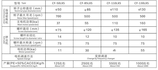 CF-50LXS連續式密煉機、CF-85LXS連續式密煉機、CF-110LXS連續式密煉機、CF-130LXS連續式密煉機